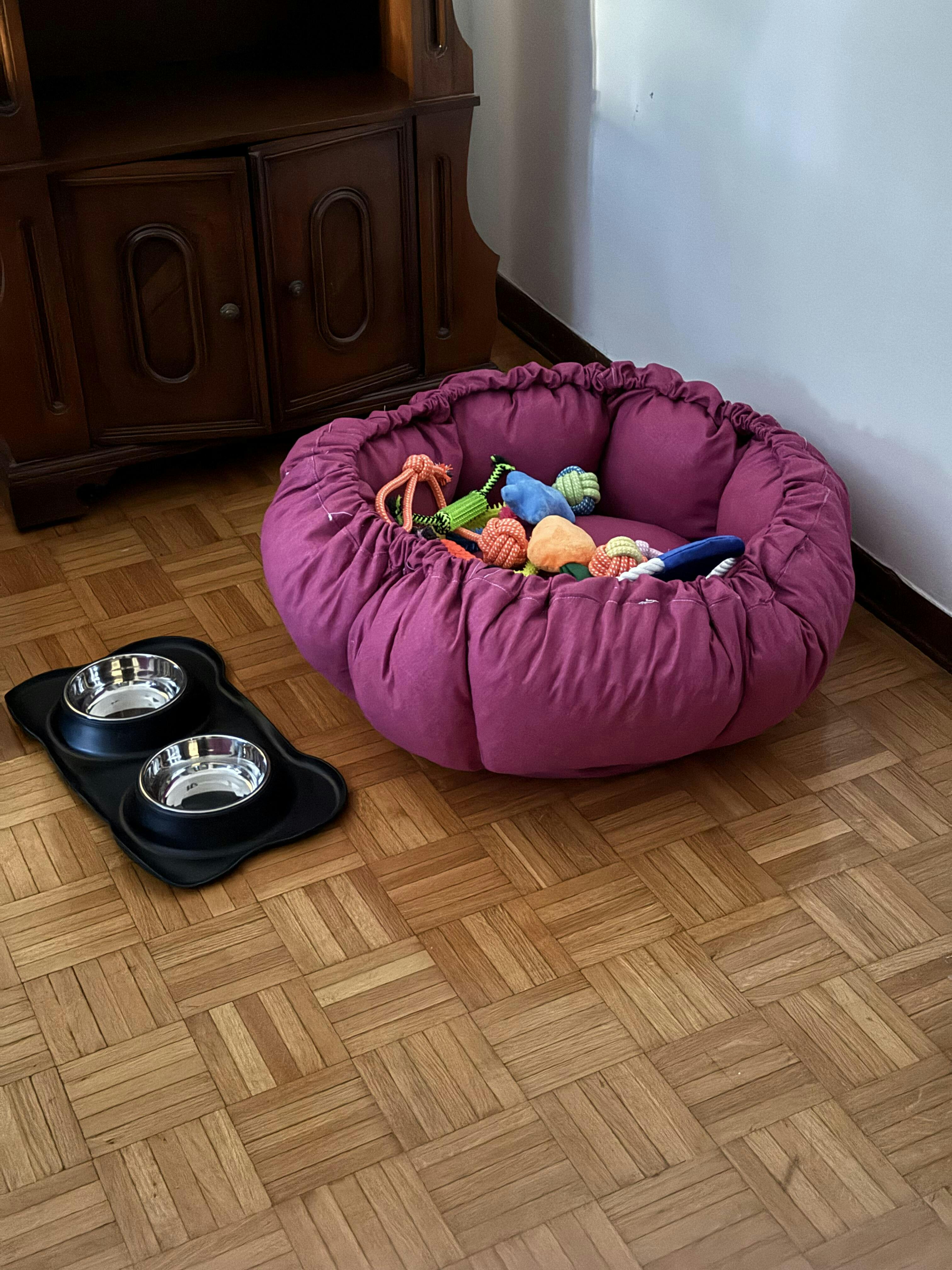 Cuccia a fiore in cotone loneta: tirando il laccio i lati si alzano, creando un nido accogliente e originale per il tuo amico a 4 zampe.
